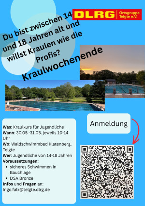 Am 30.05 und 31.05 laden wir alle interessierten von 14 - 18 Jahre außerhalb der DLRG Telgte ein, sich intensiv mit dem Kraulschwimmen zu beschäftigen. Näheres bitte der Anmeldung entnehmenHier geht es zur Anmeldung